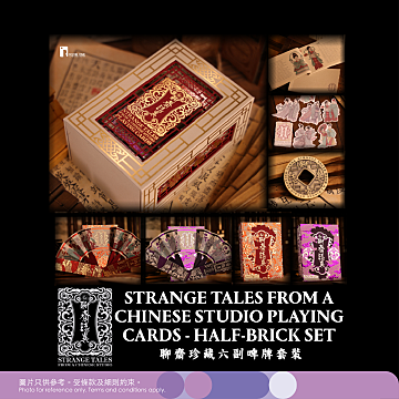 聊齋珍藏六副啤牌套裝專為忠實藏家打造,特別版各一副,標準版各兩副,齊集於高級收藏盒中,並附贈紀念幣,聊齋典故及認證書。延續系列一貫的精緻工藝、定制牌面與標誌性包裝,為整套藏品提供一體化嘅展示與保存方案,盡顯收藏級品味。