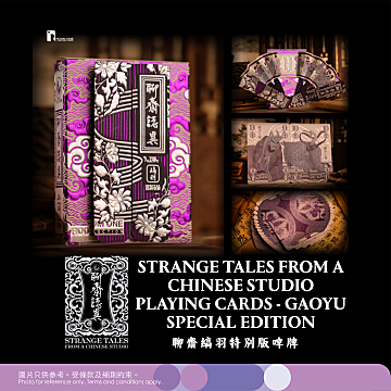 聊齋縞⽻特別版啤牌以紙扇造型牌盒匠心呈現,閉合時宛如一柄摺扇,優雅含蓄;打開後則化身為靈巧手扇,姿態流麗。牌盒綴以瑰麗燙金與精緻壓紋,靈感源自古典中國藝術,完美平衡空靈意境與不朽傳說,盡顯東方美學精髓全球只有3000副。